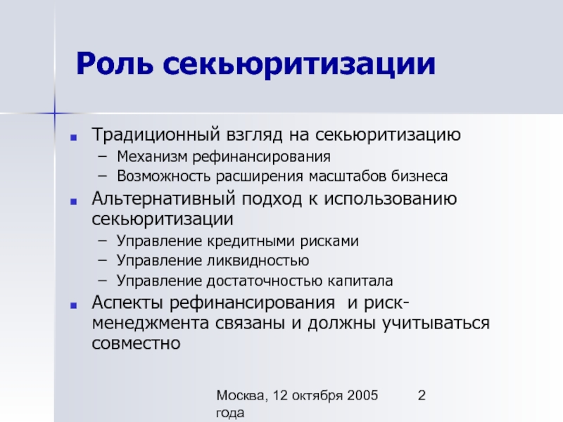 Одним из необходимых условий эффективного управления систематическим кредитными риском портфеля после его размещения является возможность его беспрепятственной продажи третьим лицам