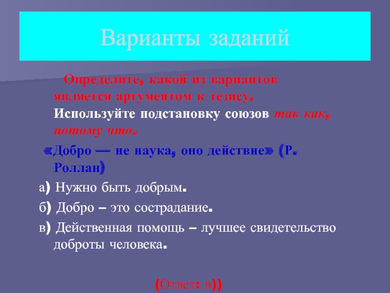 Определите, какой из вариантов является аргументом к тезису. Используйте