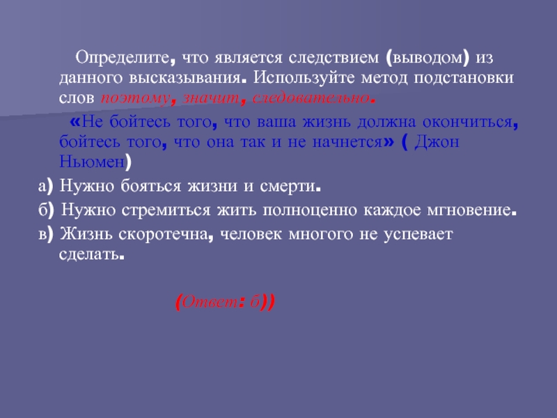 Слайд 92 Определите, что является следствием (выводом) из данного высказывания. Используйте