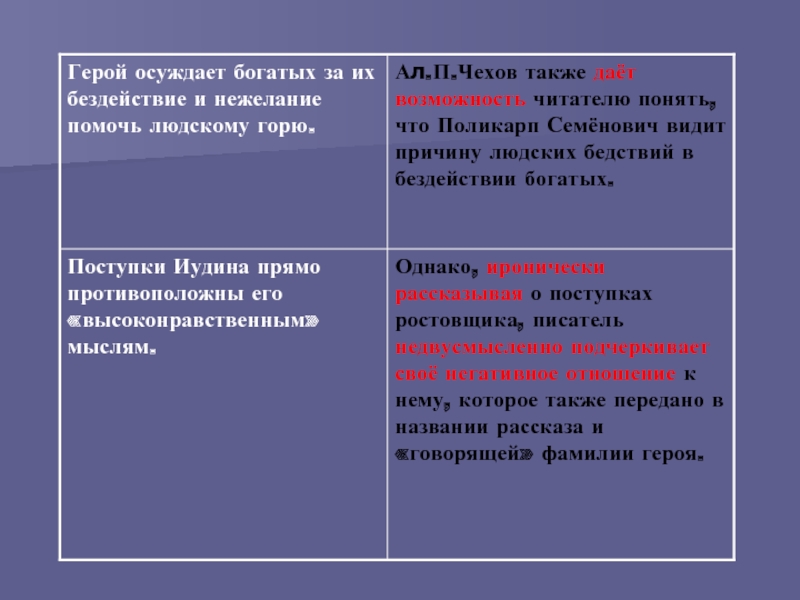жизни П.С.Иудина, писатель обращает внимание читателя на гуманность философских рассуждений этого героя, якобы страдающего от несправедливого устройства мира. Ал.П.Чехов так мастерски передает его мысли, что не возникает даже сомнений в том, что и в жизни ростовщик помогает бедным людям. Однако его диалог с помощником позволил увидеть, что на самом деле Иудин никогда не упустит личной выгоды, а поэтому безжалостно обирает людей, оказавшихся в затруднительном материальном положении.