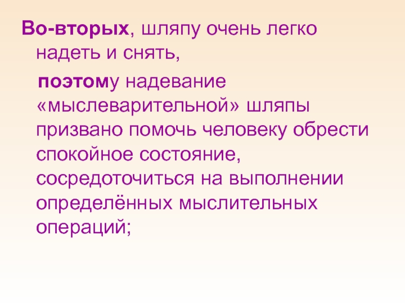 «мыслеварительной» шляпы призвано помочь человеку обрести спокойное состояние, сосредоточиться на выполнении определённых мыслительных операций;