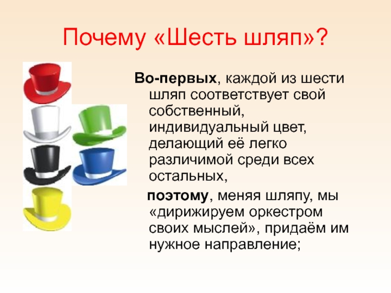 Во-первых, каждой из шести шляп соответствует свой собственный, индивидуальный