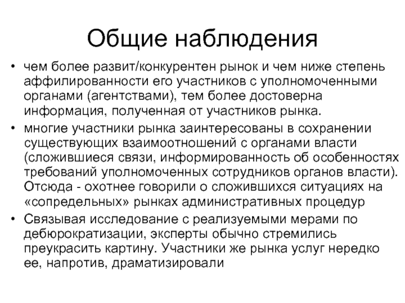 многие участники рынка заинтересованы в сохранении существующих взаимоотношений с органами власти (сложившиеся связи, информированность об особенностях требований уполномоченных сотрудников органов власти). Отсюда - охотнее говорили о сложившихся ситуациях на «сопредельных» рынках административных процедур