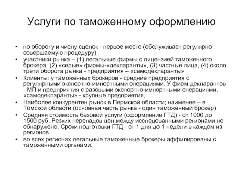 Средняя стоимость базовой услуги (оформление ГТД) - от 1000 до 1500 руб. Резких перепадов цен между исследованными регионами не обнаружено. Сроки подготовки ГТД - от 1 дня до 1 недели в каждом из регионов