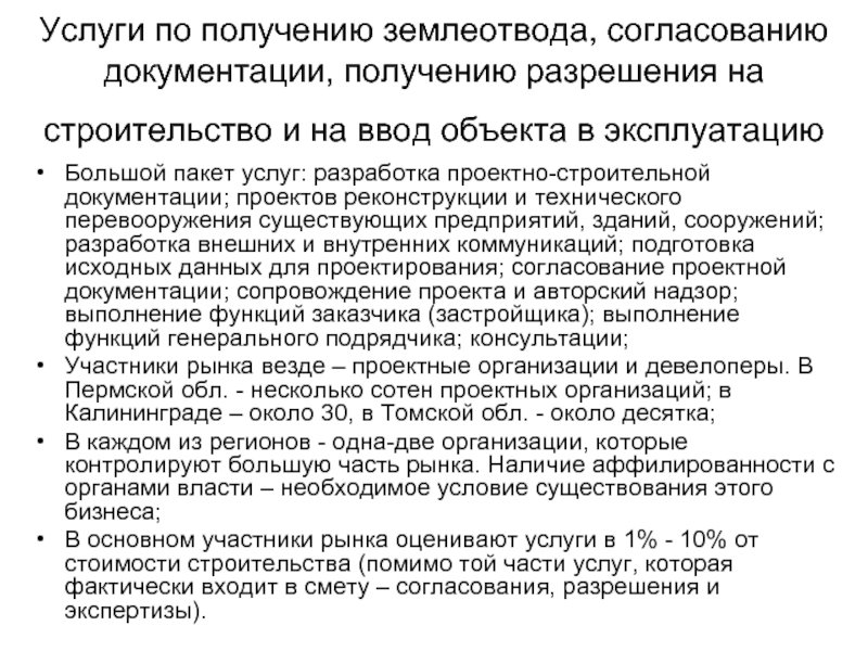 Слайд 14Услуги по получению землеотвода, согласованию документации, получению разрешения на строительство и