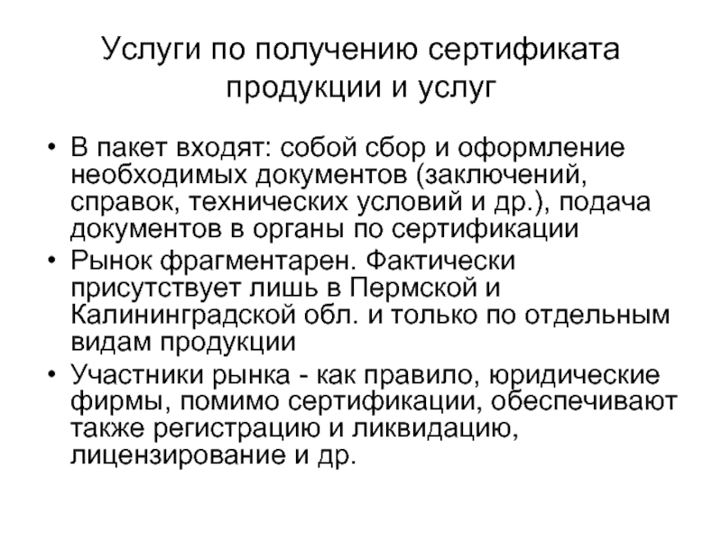 Участники рынка - как правило, юридические фирмы, помимо сертификации, обеспечивают также регистрацию и ликвидацию, лицензирование и др.