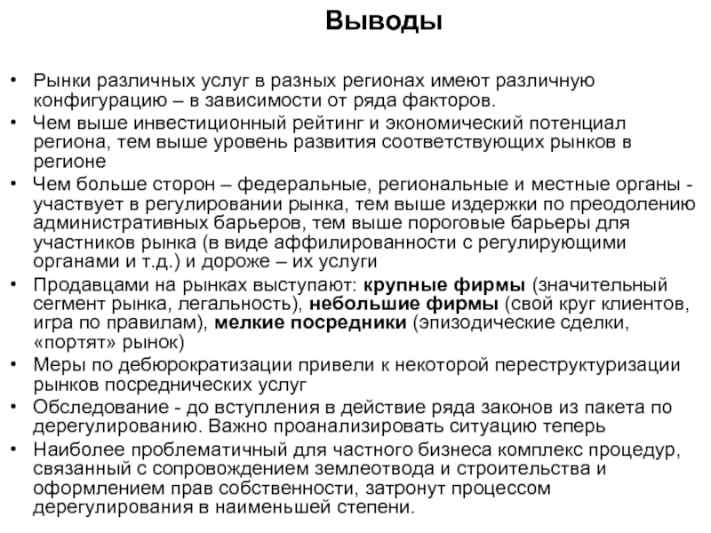 Чем больше сторон – федеральные, региональные и местные органы - участвует в регулировании рынка, тем выше издержки по преодолению административных барьеров, тем выше пороговые барьеры для участников рынка (в виде аффилированности с регулирующими органами и т.д.) и дороже – их услуги