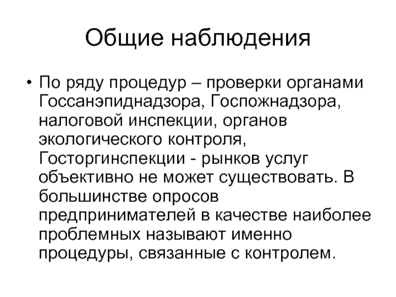 инспекции, органов экологического контроля, Госторгинспекции - рынков услуг объективно не может существовать. В большинстве опросов предпринимателей в качестве наиболее проблемных называют именно процедуры, связанные с контролем.