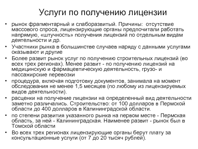 спроса, лицензирующие органы предпочитали работать напрямую, «штучность» получения лицензий по отдельным видам деятельности и др.