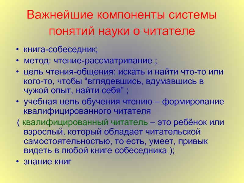 Слайд 15Важнейшие компоненты системы понятий науки о читателе
