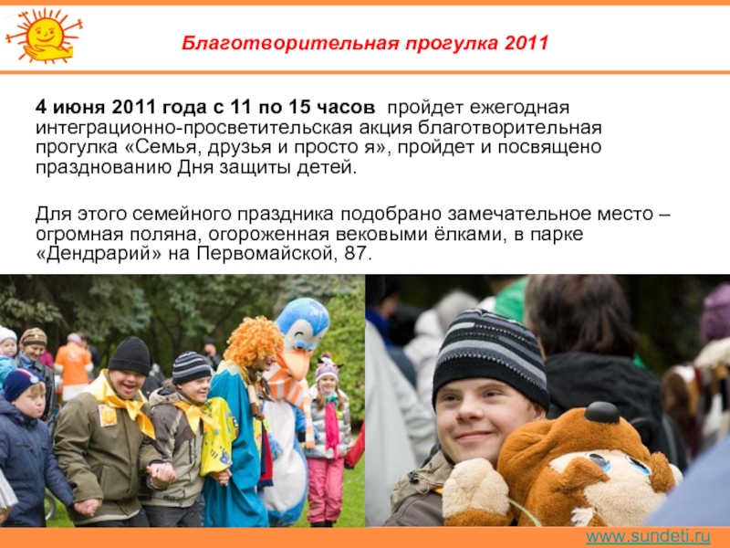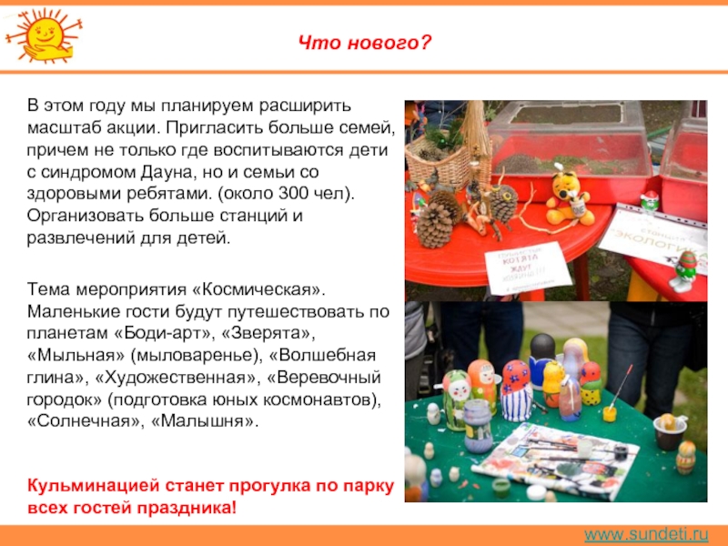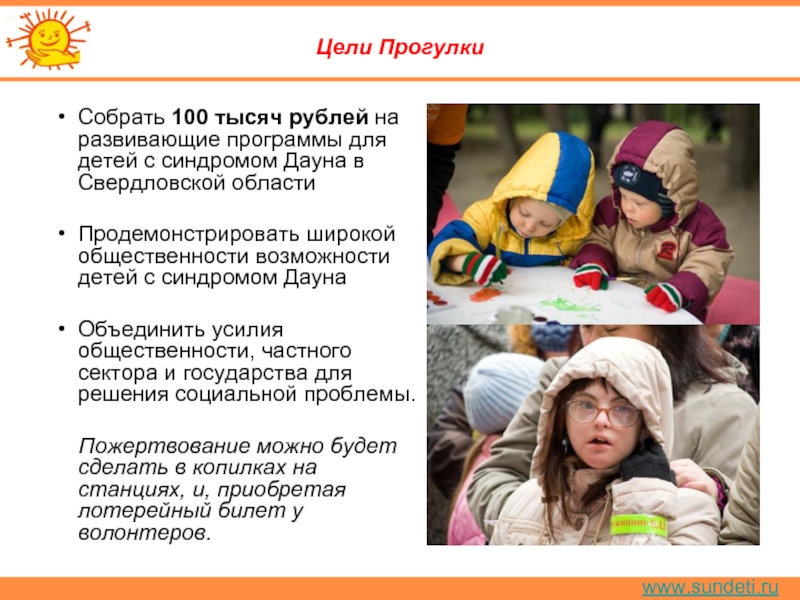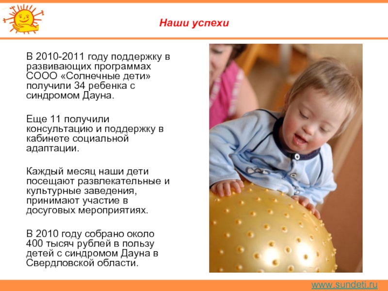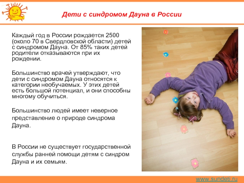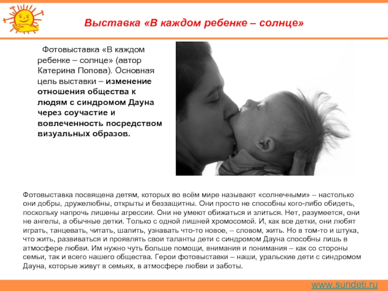Фотовыставка посвящена детям, которых во всём мире называют «солнечными» – настолько они добры, дружелюбны, открыты и беззащитны. Они просто не способны кого-либо обидеть, поскольку напрочь лишены агрессии. Они не умеют обижаться и злиться. Нет, разумеется, они не ангелы, а обычные детки. Только с одной лишней хромосомой. И, как все детки, они любят играть, танцевать, читать, шалить, узнавать что-то новое, – словом, жить. Но в том-то и штука, что жить, развиваться и проявлять свои таланты дети с синдромом Дауна способны лишь в атмосфере любви. Им нужно чуть больше помощи, внимания и понимания – как со стороны семьи, так и всего нашего общества. Герои фотовыставки – наши, уральские дети с синдромом Дауна, которые живут в семьях, в атмосфере любви и заботы.
