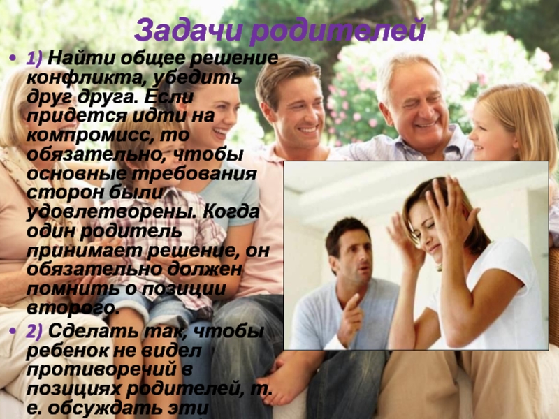 идти на компромисс, то обязательно, чтобы основные требования сторон были удовлетворены. Когда один родитель принимает решение, он обязательно должен помнить о позиции второго.