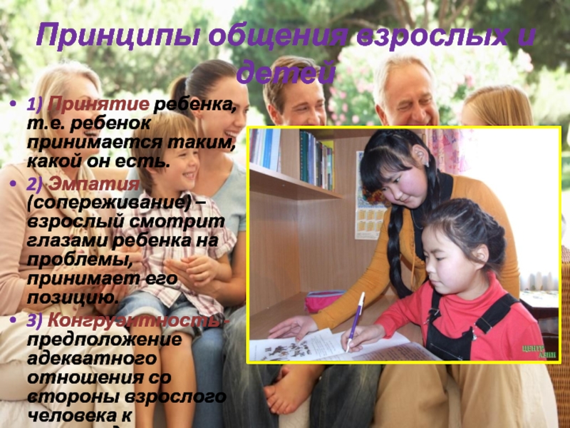 2) Эмпатия (сопереживание) – взрослый смотрит глазами ребенка на проблемы, принимает его позицию.