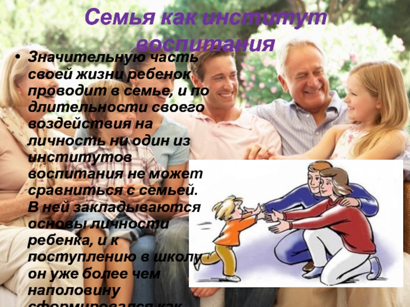 и по длительности своего воздействия на личность ни один из институтов воспитания не может сравниться с семьей. В ней закладываются основы личности ребенка, и к поступлению в школу он уже более чем наполовину сформировался как личность.