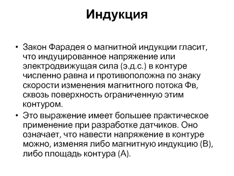 Это выражение имеет большее практическое применение при разработке датчиков. Оно означает, что навести напряжение в контуре можно, изменяя либо магнитную индукцию (В), либо площадь контура (А).