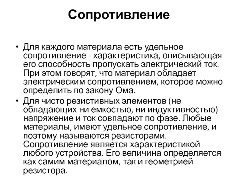 Для чисто резистивных элементов (не обладающих ни емкостью, ни индуктивностью) напряжение и ток совпадают по фазе. Любые материалы, имеют удельное сопротивление, и поэтому называются резисторами. Сопротивление является характеристикой любого устройства. Его величина определяется как самим материалом, так и геометрией резистора.