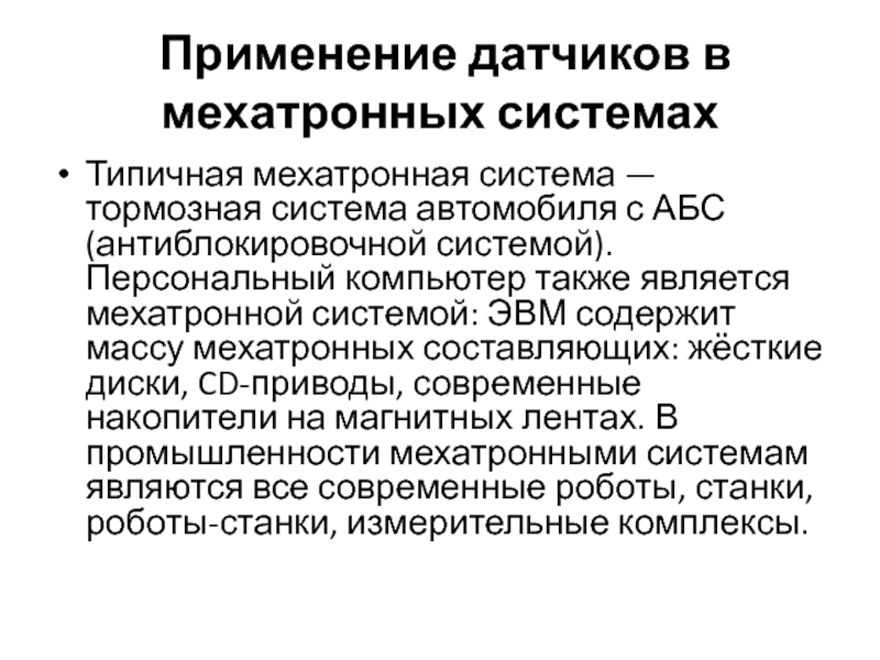 автомобиля с АБС (антиблокировочной системой). Персональный компьютер также является мехатронной системой: ЭВМ содержит массу мехатронных составляющих: жёсткие диски, CD-приводы, современные накопители на магнитных лентах. В промышленности мехатронными системам являются все современные роботы, станки, роботы-станки, измерительные комплексы.