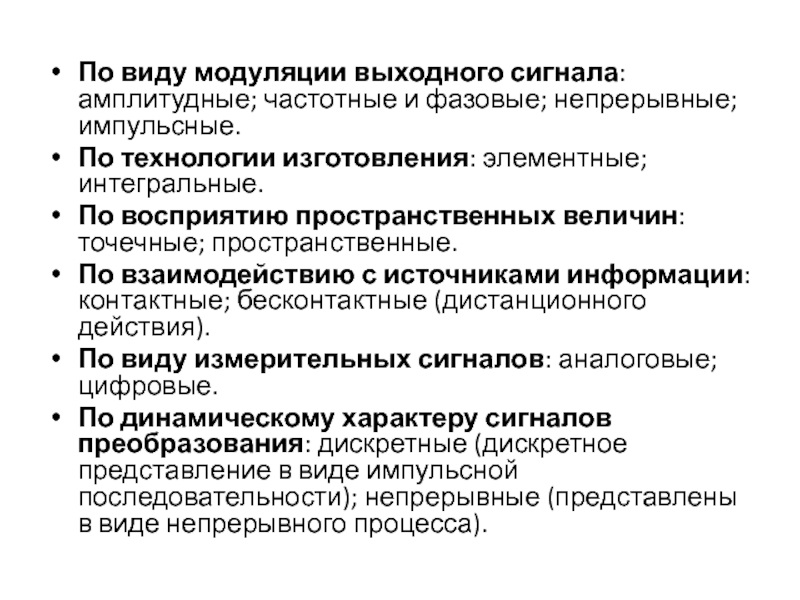 По виду модуляции выходного сигнала: амплитудные; частотные и фазовые; непрерывные; импульсные.
