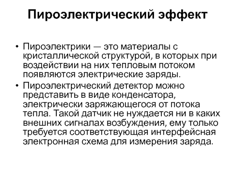 Пироэлектрический детектор можно представить в виде конденсатора, электрически заряжающегося от потока тепла. Такой датчик не нуждается ни в каких внешних сигналах возбуждения, ему только требуется соответствующая интерфейсная электронная схема для измерения заряда.