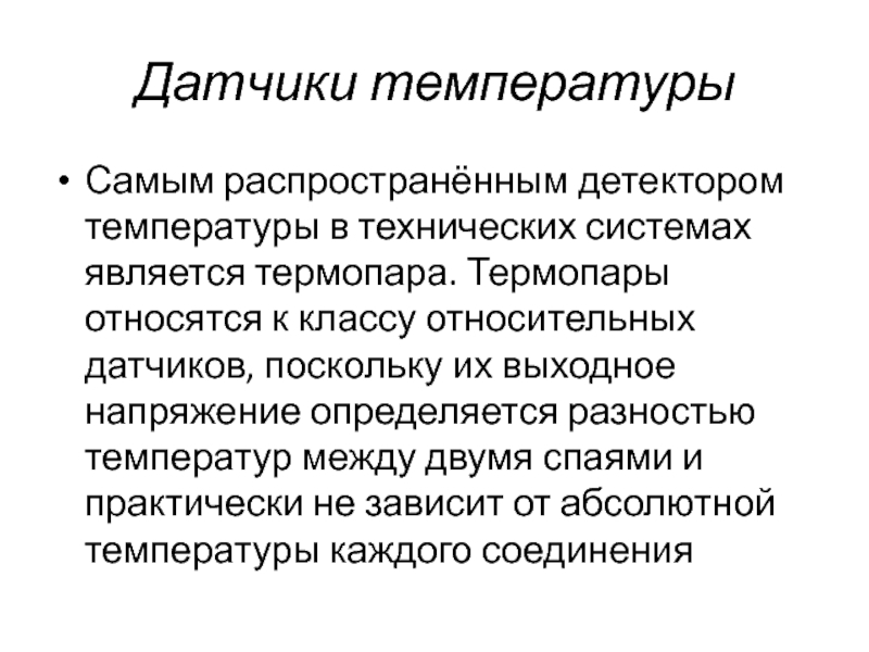 относятся к классу относительных датчиков, поскольку их выходное напряжение определяется разностью температур между двумя спаями и практически не зависит от абсолютной температуры каждого соединения