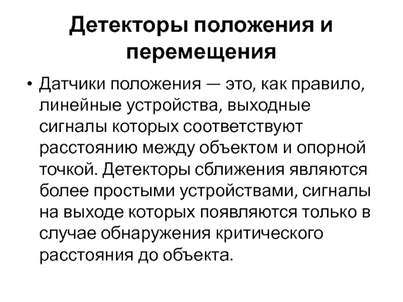 выходные сигналы которых соответствуют расстоянию между объектом и опорной точкой. Детекторы сближения являются более простыми устройствами, сигналы на выходе которых появляются только в случае обнаружения критического расстояния до объекта.