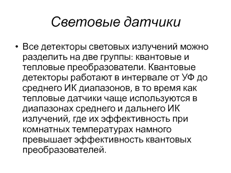 и тепловые преобразователи. Квантовые детекторы работают в интервале от УФ до среднего ИК диапазонов, в то время как тепловые датчики чаще используются в диапазонах среднего и дальнего ИК излучений, где их эффективность при комнатных температурах намного превышает эффективность квантовых преобразователей.
