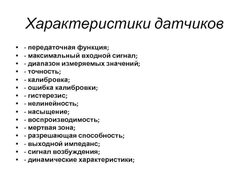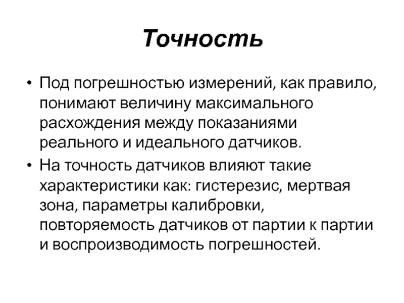 На точность датчиков влияют такие характеристики как: гистерезис, мертвая зона, параметры калибровки, повторяемость датчиков от партии к партии и воспроизводимость погрешностей.