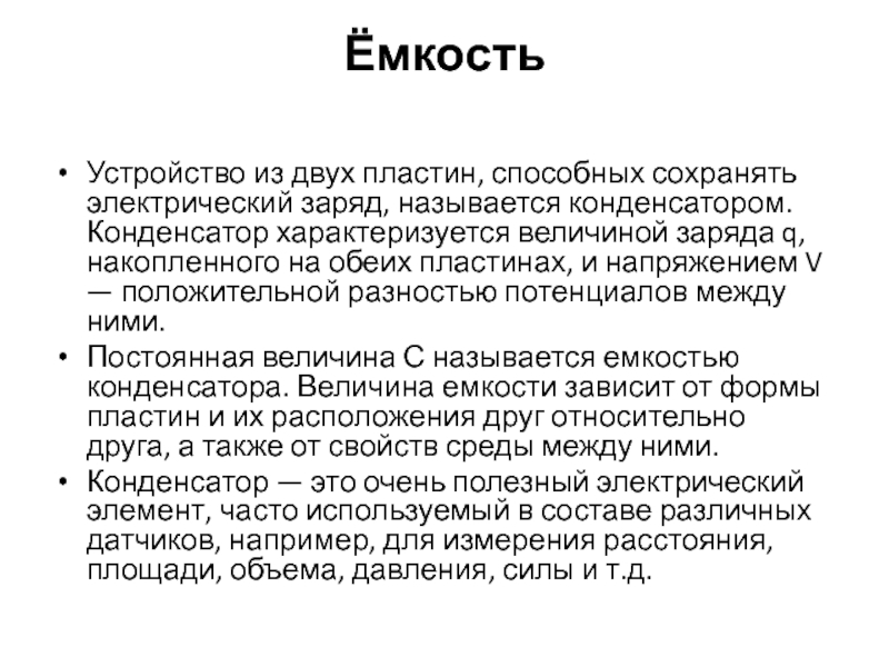 Конденсатор — это очень полезный электрический элемент, часто используемый в составе различных датчиков, например, для измерения расстояния, площади, объема, давления, силы и т.д.