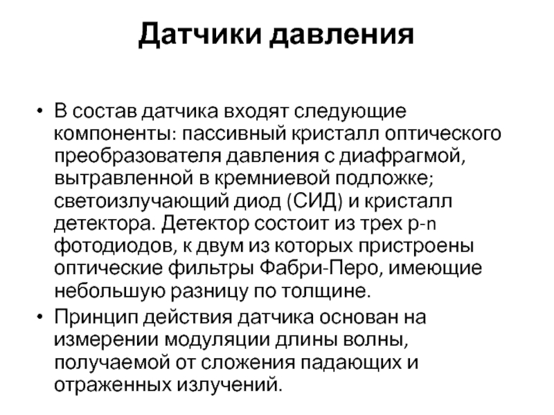 давления с диафрагмой, вытравленной в кремниевой подложке; светоизлучающий диод (СИД) и кристалл детектора. Детектор состоит из трех р-n фотодиодов, к двум из которых пристроены оптические фильтры Фабри-Перо, имеющие небольшую разницу по толщине.