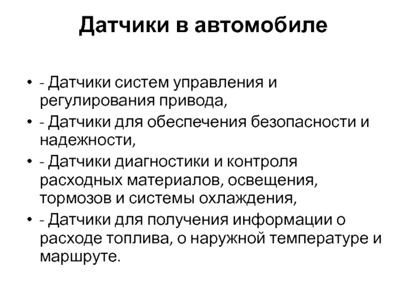 - Датчики диагностики и контроля расходных материалов, освещения, тормозов и системы охлаждения,