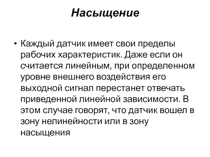 линейным, при определенном уровне внешнего воздействия его выходной сигнал перестанет отвечать приведенной линейной зависимости. В этом случае говорят, что датчик вошел в зону нелинейности или в зону насыщения