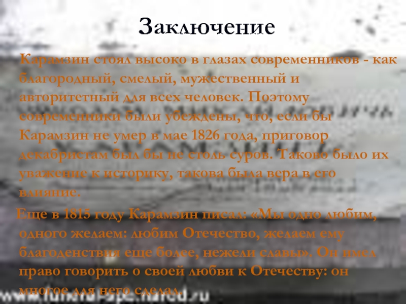 смелый, мужественный и авторитетный для всех человек. Поэтому современники были убеждены, что, если бы Карамзин не умер в мае 1826 года, приговор декабристам был бы не столь суров. Таково было их уважение к историку, такова была вера в его влияние.