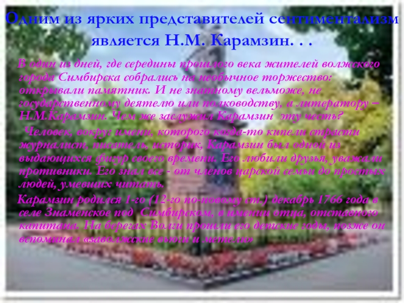 В один из дней, где середины прошлого века жителей волжского города Симбирска собрались на необычное торжество: открывали памятник. И не знатному вельможе, не государственному деятелю или полководству, а литератору – Н.М.Карамзин. Чем же заслужил Карамзин эту честь?