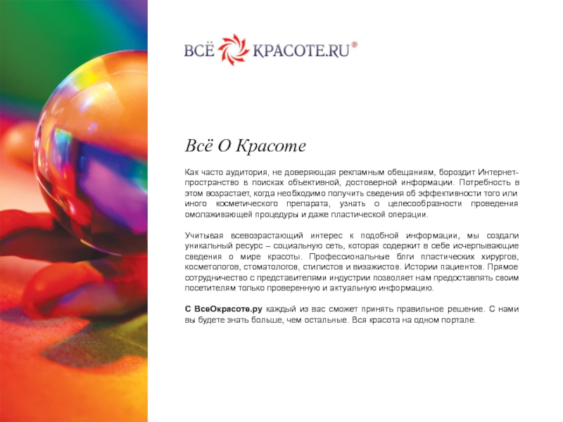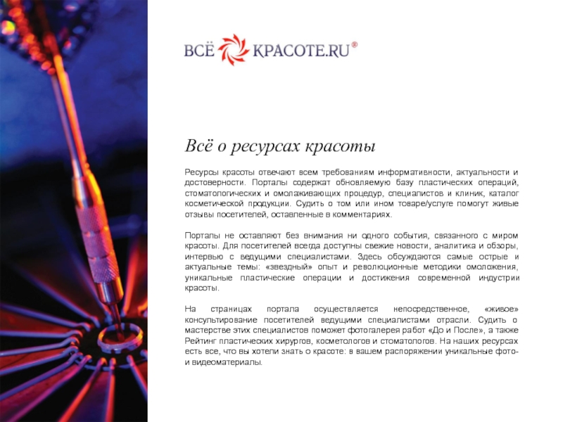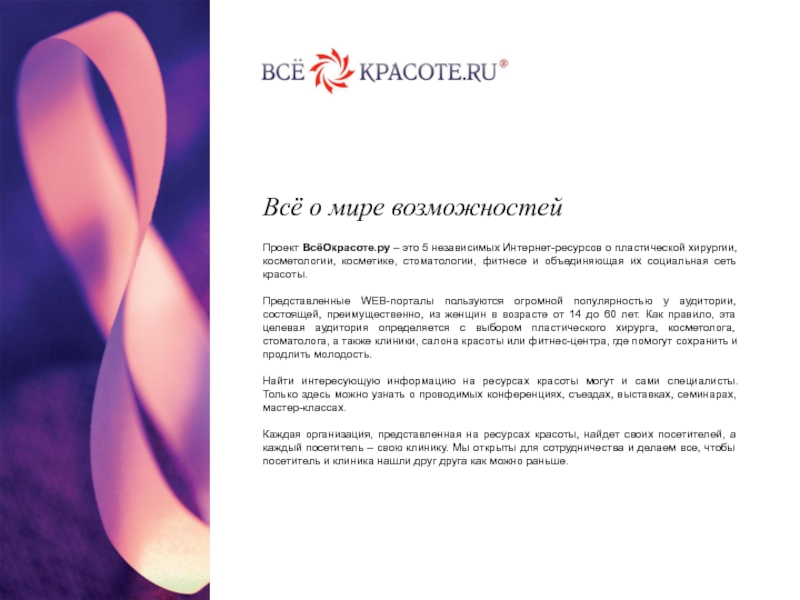 пластической хирургии, косметологии, косметике, стоматологии, фитнесе и объединяющая их социальная сеть красоты.