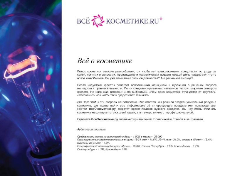 Для того чтобы эти вопросы не оставались без ответов, мы решили создать уникальный ресурс о косметике, где можно найти всю информацию об интересующем продукте или производителе. Портал ВсеОкосметике.ру сократит время поисков нужного средства. Вы научитесь отличать косметику масс-маркет от люксовой серии, а аптечную линию от профессиональной.