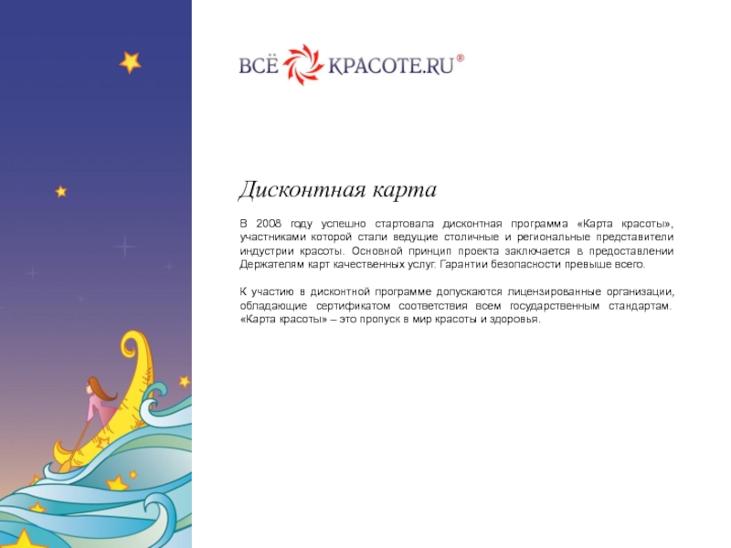 К участию в дисконтной программе допускаются лицензированные организации, обладающие сертификатом соответствия всем государственным стандартам. «Карта красоты» – это пропуск в мир красоты и здоровья.