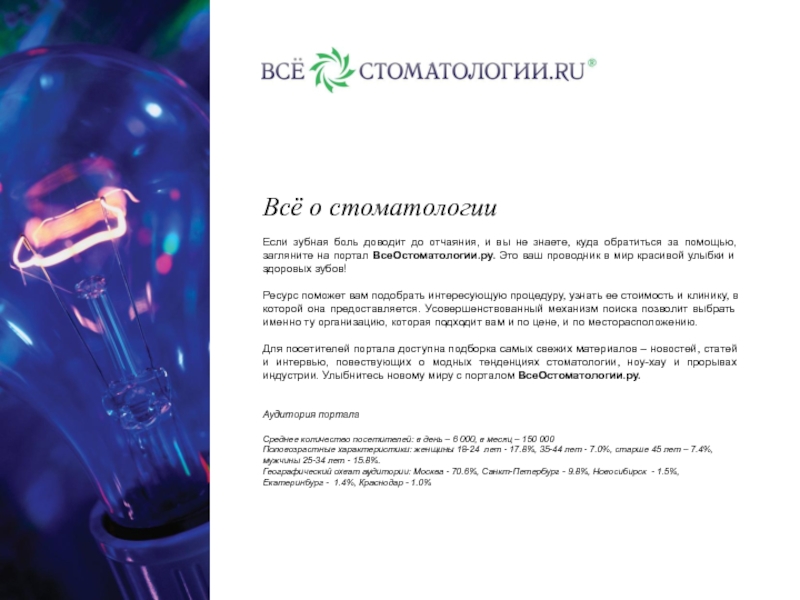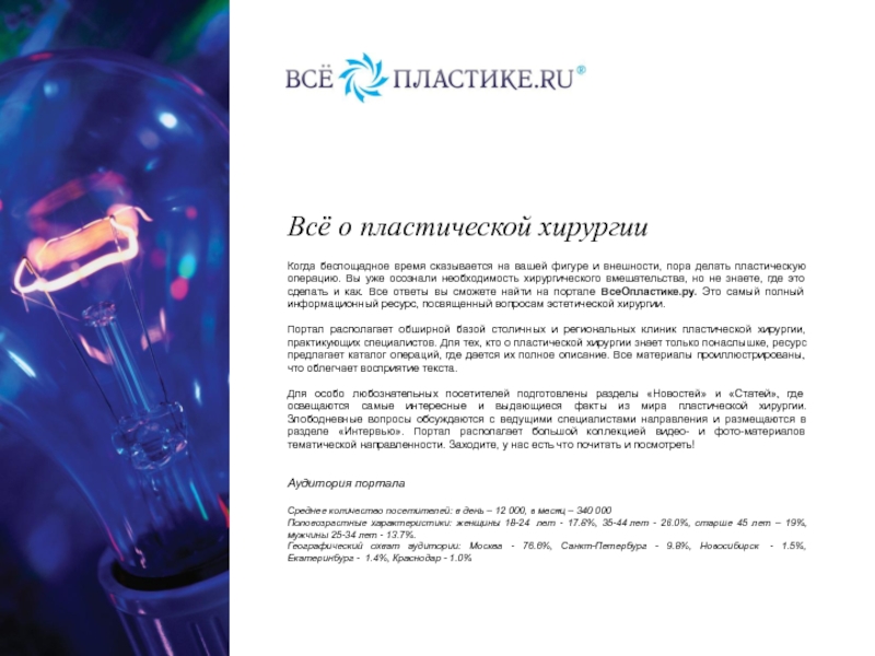 Представленные WEB-порталы пользуются огромной популярностью у аудитории, состоящей, преимущественно, из женщин в возрасте от 14 до 60 лет. Как правило, эта целевая аудитория определяется с выбором пластического хирурга, косметолога, стоматолога, а также клиники, салона красоты или фитнес-центра, где помогут сохранить и продлить молодость.