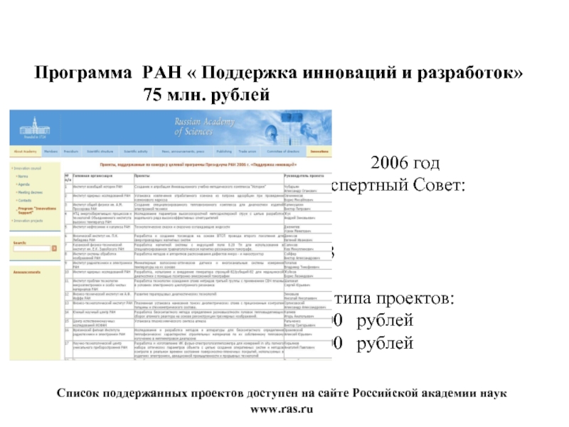 Список поддержанных проектов доступен на сайте Российской академии наук