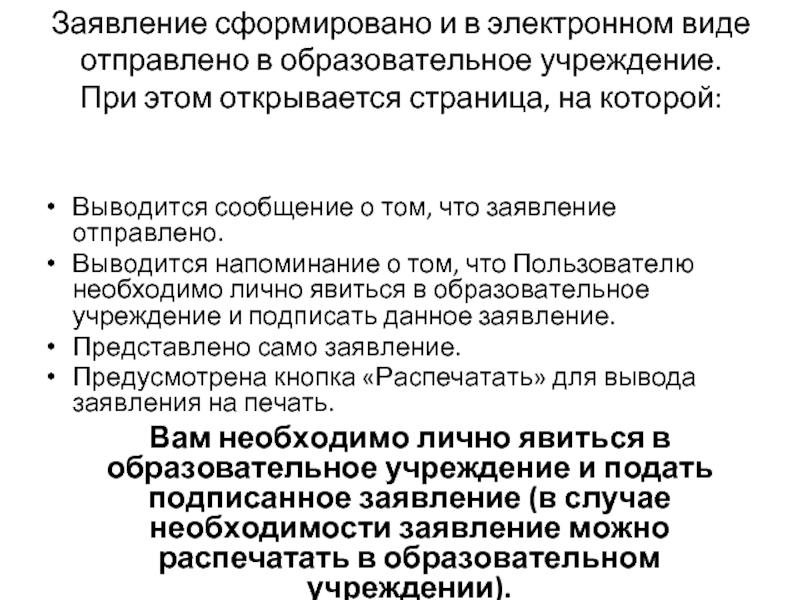 Выводится напоминание о том, что Пользователю необходимо лично явиться в образовательное учреждение и подписать данное заявление.