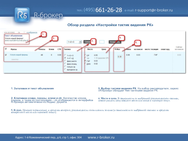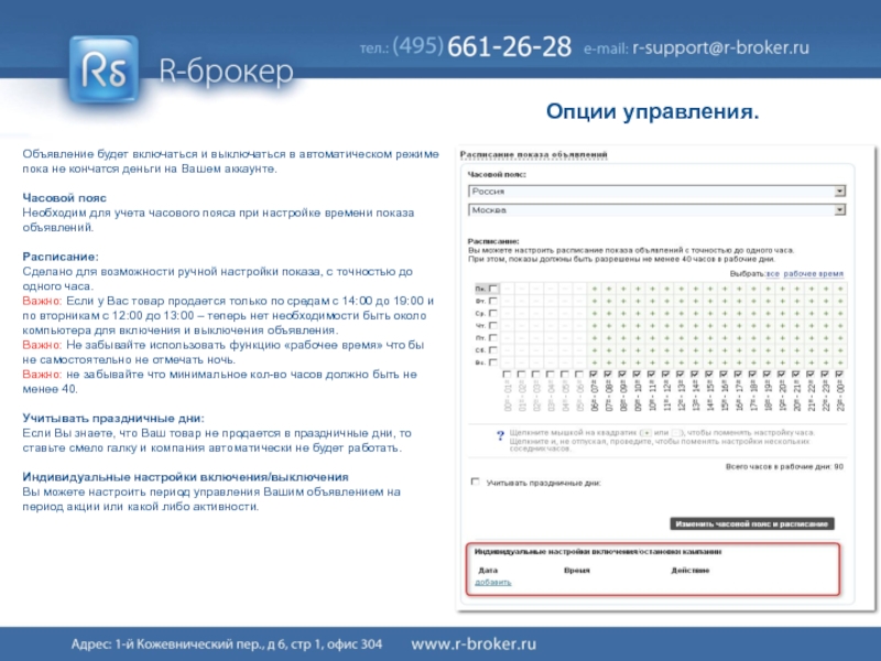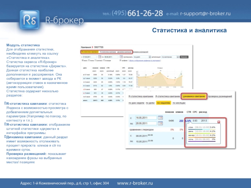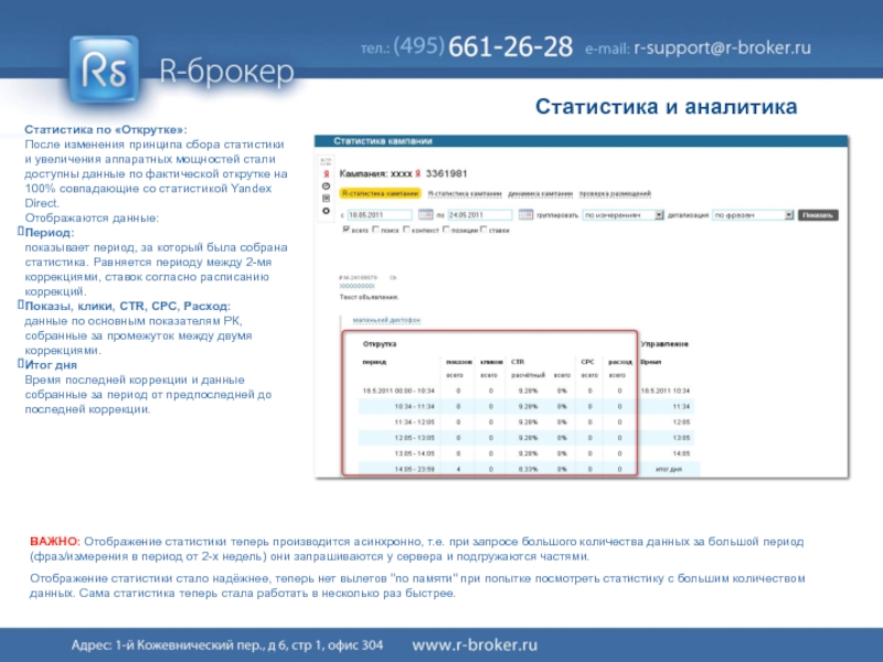 Важно: с помощью опции «Статистика по управлению» можно отслеживать активность конкурентов и согласно полученным данным «подстраивать» настройки R-broker. Так что бы во время пиковой активности занимать более выгодную позицию или наоборот уходить на более дешевые размещения.