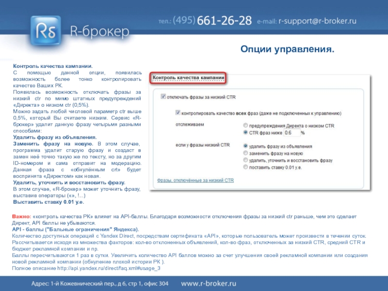 Важно: «контроль качества РК» влияет на API-баллы. Благодаря возможности отключения фразы за низкий ctr раньше, чем это сделает Директ, API баллы не убываются.