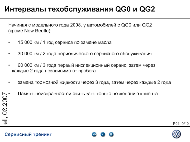 Интервалы техобслуживания QG0 и QG2