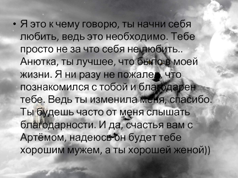 необходимо. Тебе просто не за что себя не любить.. Анютка, ты лучшее, что было в моей жизни. Я ни разу не пожалел, что познакомился с тобой и благодарен тебе. Ведь ты изменила меня, спасибо. Ты будешь часто от меня слышать благодарности. И да, счастья вам с Артёмом, надеюсь он будет тебе хорошим мужем, а ты хорошей женой))