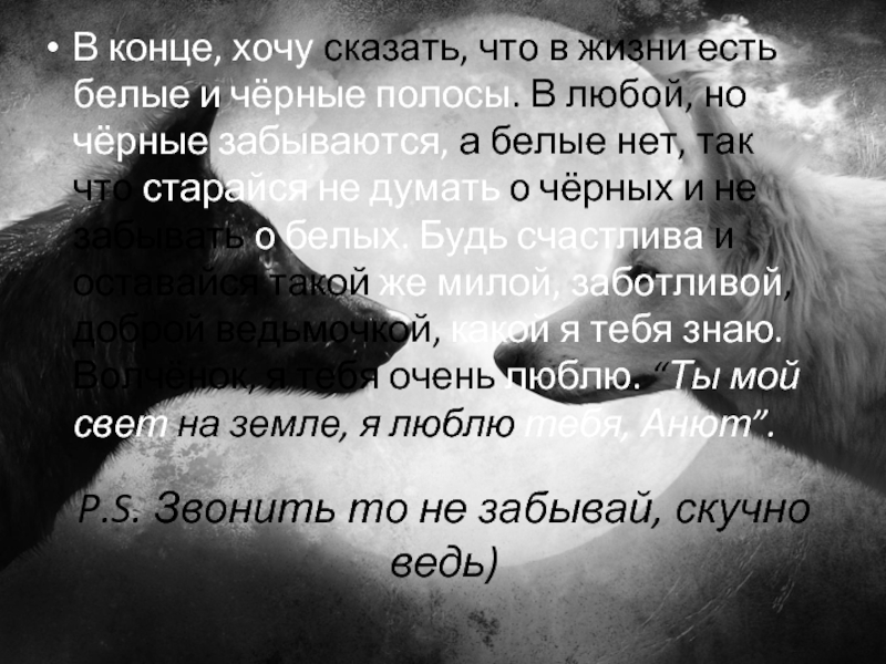 в жизни есть белые и чёрные полосы. В любой, но чёрные забываются, а белые нет, так что старайся не думать о чёрных и не забывать о белых. Будь счастлива и оставайся такой же милой, заботливой, доброй ведьмочкой, какой я тебя знаю. Волчёнок, я тебя очень люблю. “Ты мой свет на земле, я люблю тебя, Анют”.