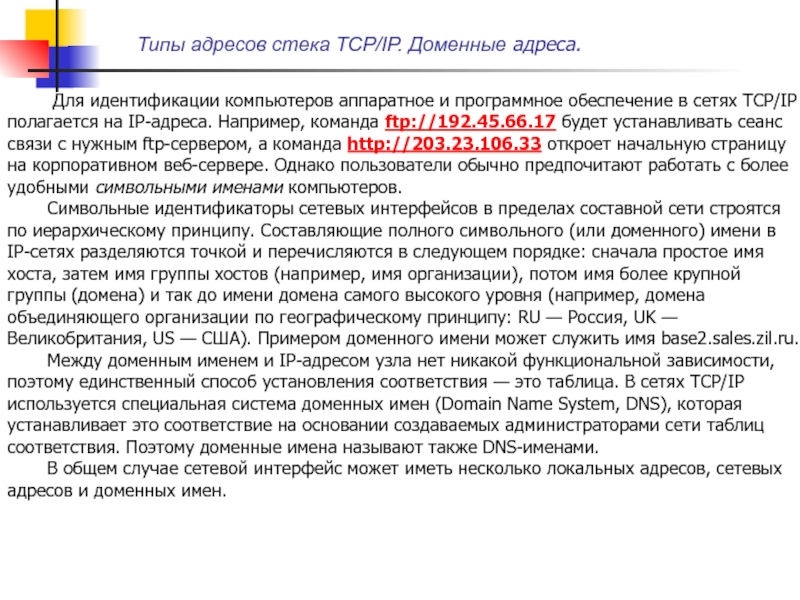 полагается на IP-адреса. Например, команда ftp://192.45.66.17 будет устанавливать сеанс связи с нужным ftp-сервером, а команда http://203.23.106.33 откроет начальную страницу на корпоративном веб-сервере. Однако пользователи обычно предпочитают работать с более удобными символьными именами компьютеров.
