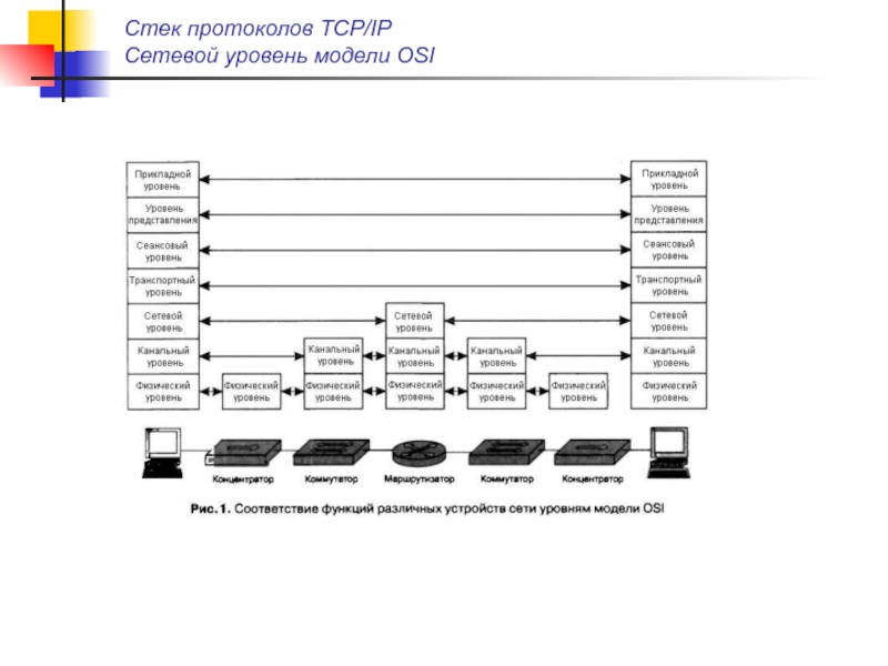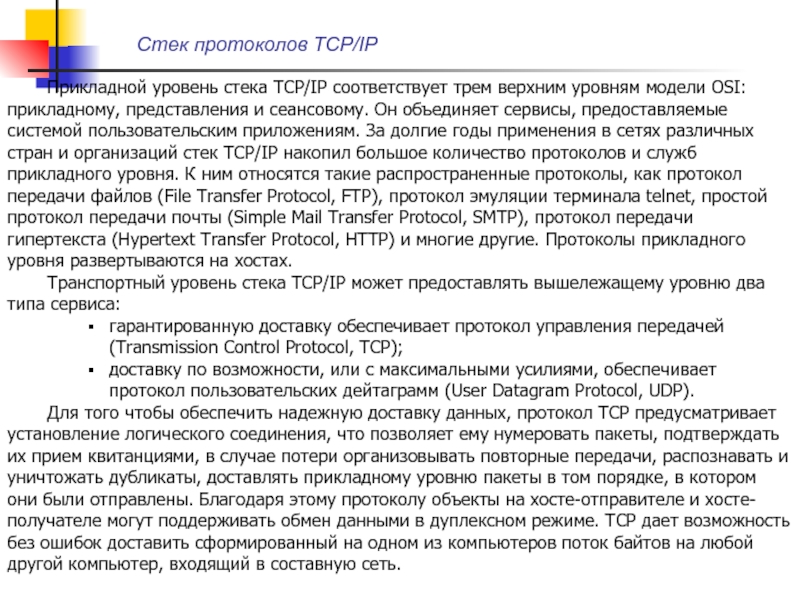 Слайд 13 Прикладной уровень стека TCP/IP соответствует трем верхним уровням модели OSI: прикладному,