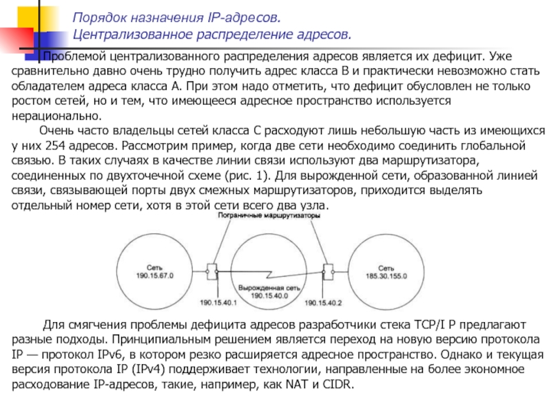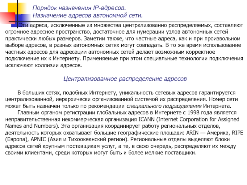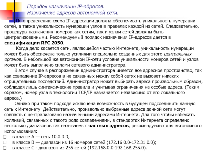 должна обеспечивать уникальность нумерации сетей, а также уникальность нумерации узлов в пределах каждой из сетей. Следовательно, процедуры назначения номеров как сетям, так и узлам сетей должны быть централизованными. Рекомендуемый порядок назначения IP-адресов дается в спецификации RFC 2050.