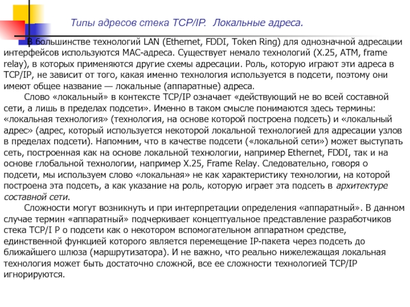 адресации интерфейсов используются МАС-адреса. Существует немало технологий (Х.25, ATM, frame relay), в которых применяются другие схемы адресации. Роль, которую играют эти адреса в TCP/IP, не зависит от того, какая именно технология используется в подсети, поэтому они имеют общее название — локальные (аппаратные) адреса.