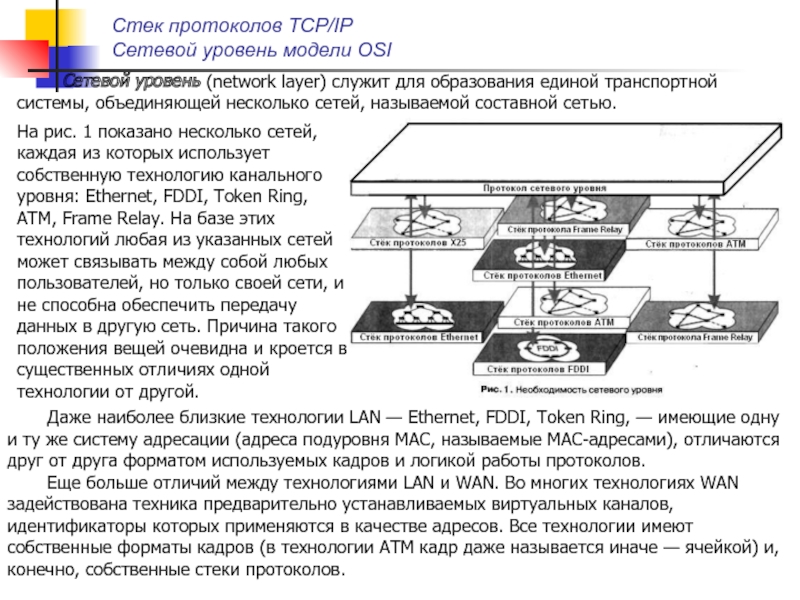 На рис. 1 показано несколько сетей, каждая из которых использует собственную технологию канального уровня: Ethernet, FDDI, Token Ring, ATM, Frame Relay. На базе этих технологий любая из указанных сетей может связывать между собой любых пользователей, но только своей сети, и не способна обеспечить передачу данных в другую сеть. Причина такого положения вещей очевидна и кроется в существенных отличиях одной технологии от другой.