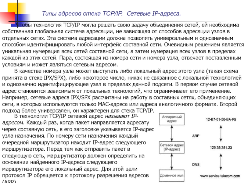 В технологии TCP/IP сетевой адрес называют IP-адресом. Каждый раз, когда пакет направляется адресату через составную сеть, в его заголовке указывается IP-адрес узла назначения. По номеру сети назначения каждый очередной маршрутизатор находит IP-адрес следующего маршрутизатора. Перед тем как отправить пакет в следующую сеть, маршрутизатор должен определить на основании найденного IP-адреса следующего маршрутизатора его локальный адрес. Для этой цели протокол IP обращается к протоколу разрешения адресов (ARP).